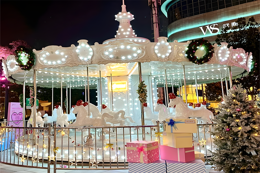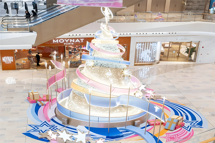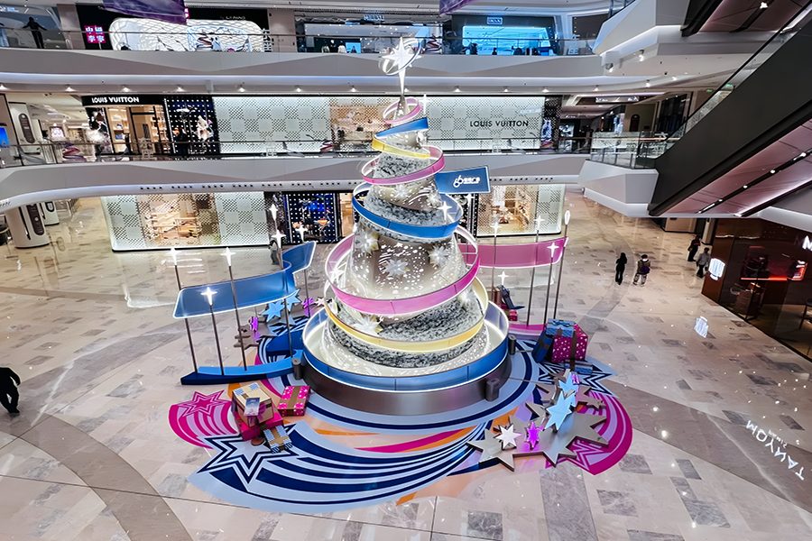 2024年,武漢恒隆廣場的圣誕樹裝置再次升級,由發(fā)光彩帶、雪花和星星環(huán)繞而成,整個裝置絢麗而夢幻,仿佛置身于童話世界之中。